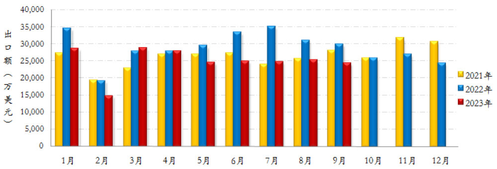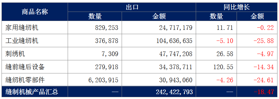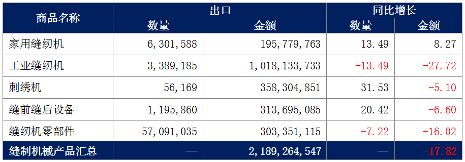 কাস্টমসের সাধারণ প্রশাসনের তথ্য অনুসারে: জানুয়ারী থেকে ২০২৩ সালের সেপ্টেম্বর পর্যন্ত, চীনের সেলাই মেশিনারি পণ্যগুলির মোট রফতানি ছিল ২.১৮৯ বিলিয়ন মার্কিন ডলার, যা বছরে বছরে ১.8.৮২% কম ছিল। গৃহস্থালি সেলাই মেশিন ছাড়াও, বিভিন্ন শিল্প সেলাই মেশিনগুলির রফতানি ভলিউম এবং শিল্পে তাদের অংশগুলি বিভিন্ন প্রশস্ততার নিম্নমুখী প্রবণতা দেখিয়েছিল।2023 সালের জানুয়ারী থেকে সেপ্টেম্বর পর্যন্ত সেলাই যন্ত্রপাতি পণ্য রফতানি